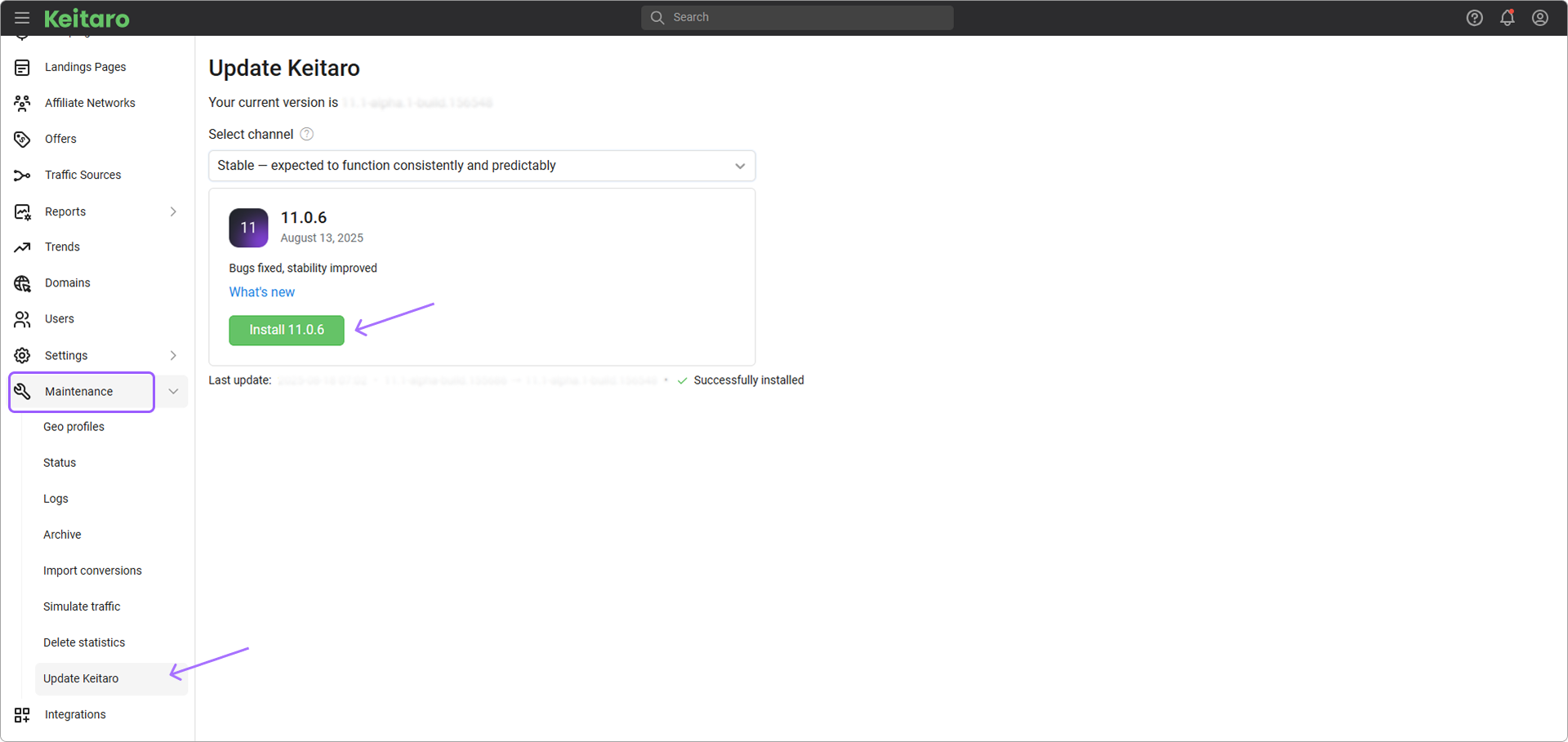 1. Log in to the tracker as an Administrator. Go to Maintenance ➝ Update Keitaro.