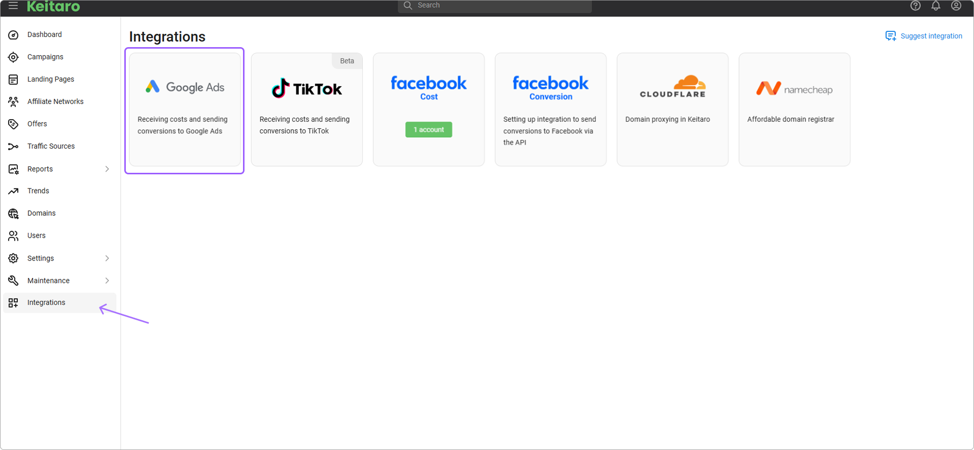 Select the Keitaro campaigns to which you want to send costs from Google account.
