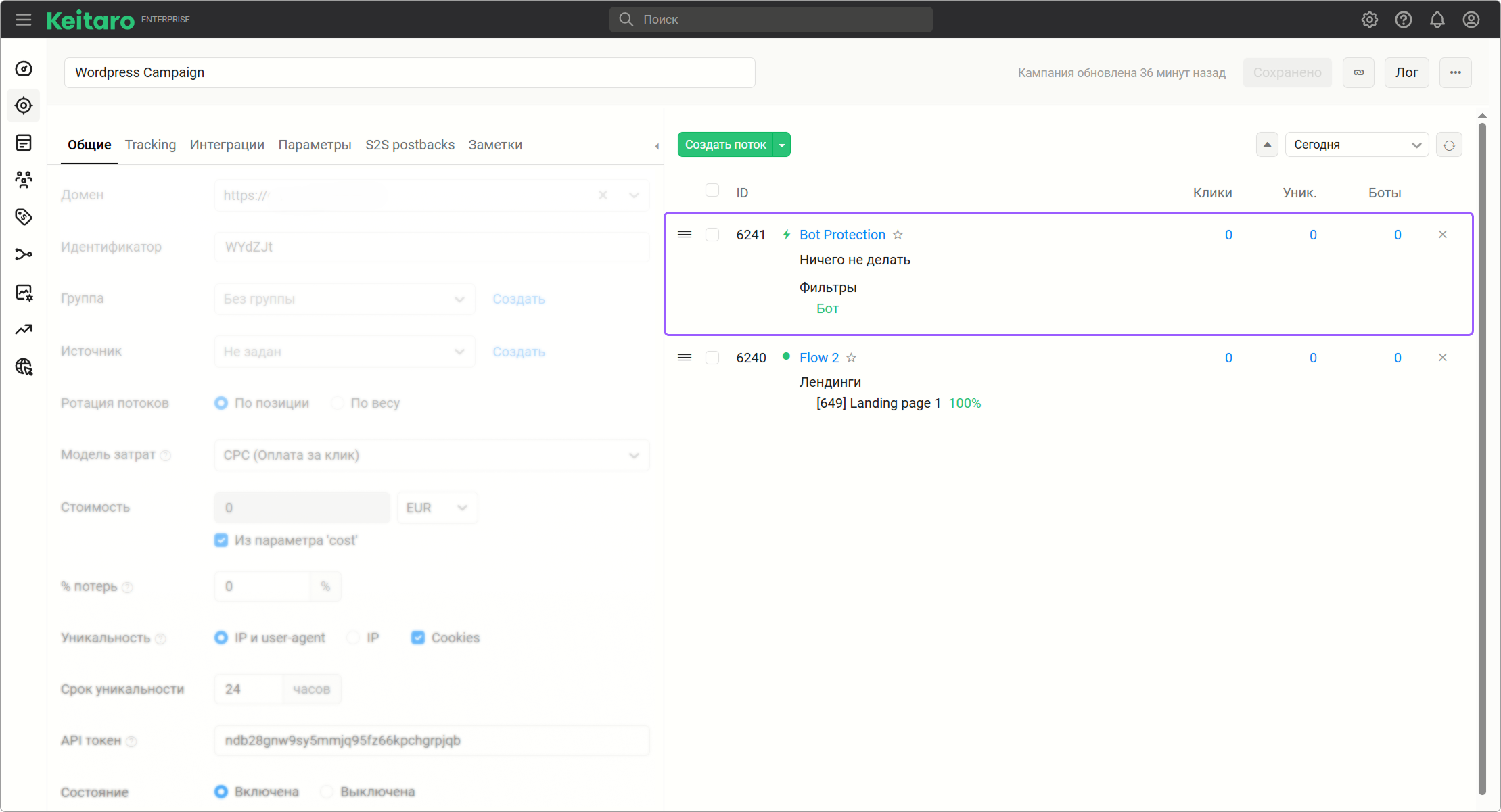 Пример настройки кампании: созданы два потока. Первый поток с действием Ничего не делать и фильтром БОТ. Данный поток фильтрует и оставляет ботов на сайте, где подключен WP plugin. Нет необходимости добавлять bot page в кампанию.