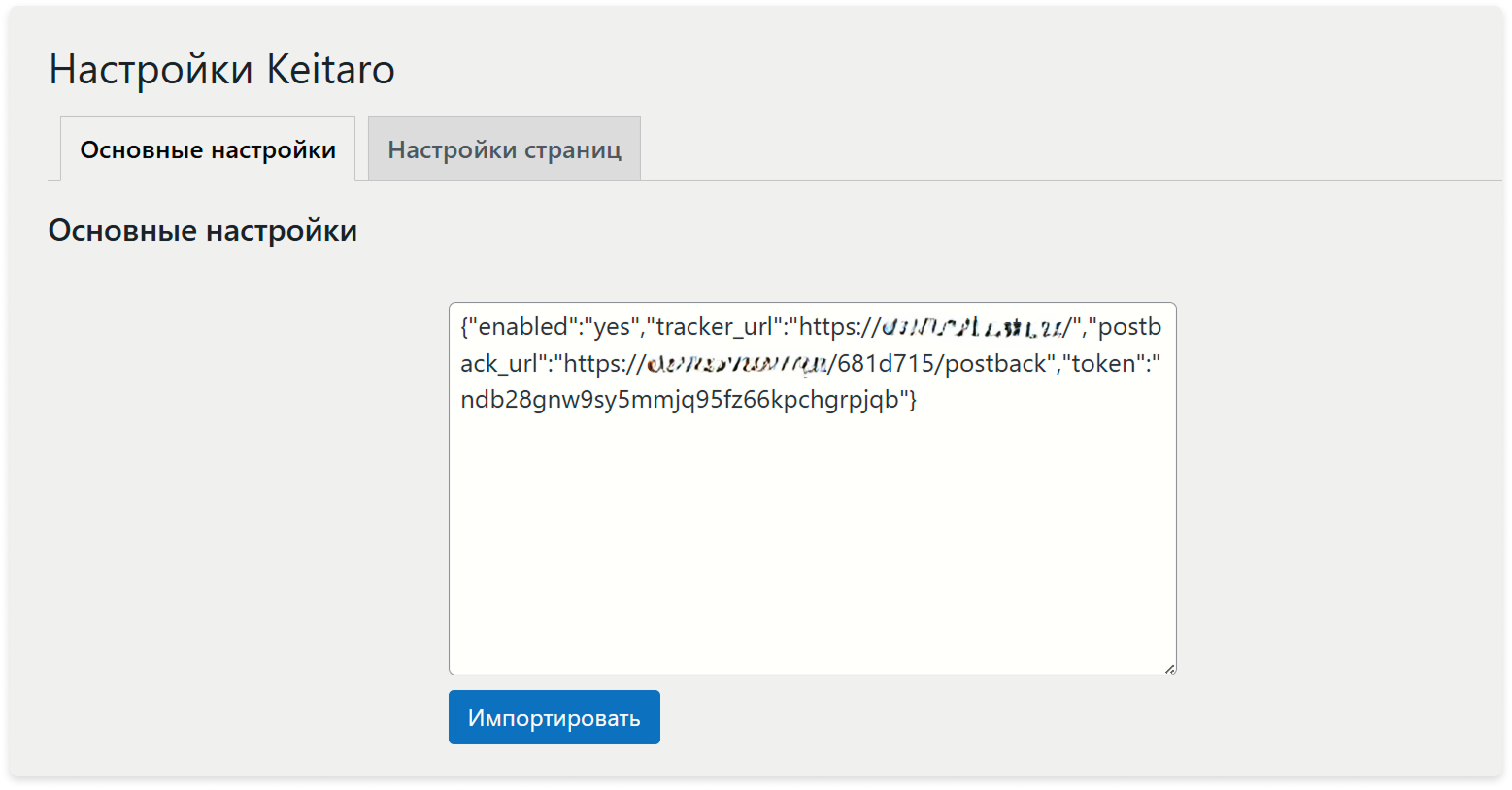 Откройте настройки плагина Keitaro в WordPress и нажмите на кнопку Импортировать настройки: