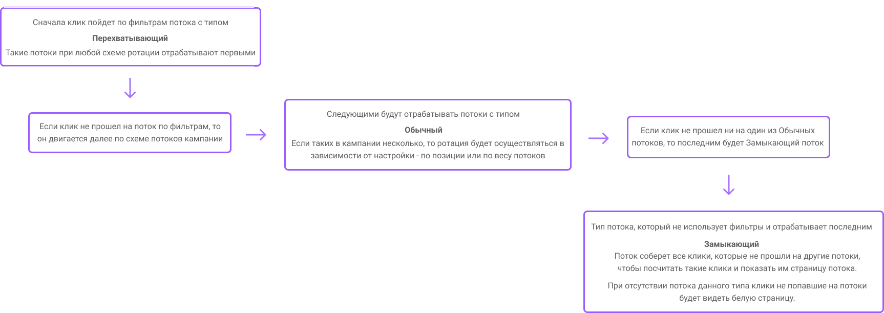 При отличии любого из параметров от заданных условий, клик не пройдет на поток и не увидит содержимого, продолжая двигаться по схеме потоков далее в соответствии с настройкой потоков.