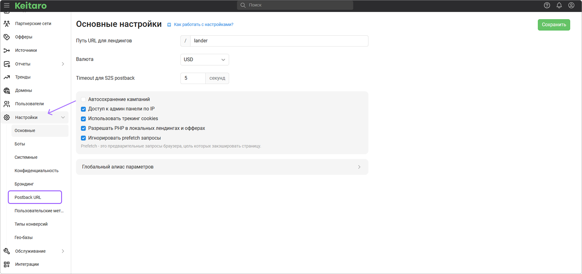 - Для создания индивидуальной ссылки откройте Настройки → Postback URL.