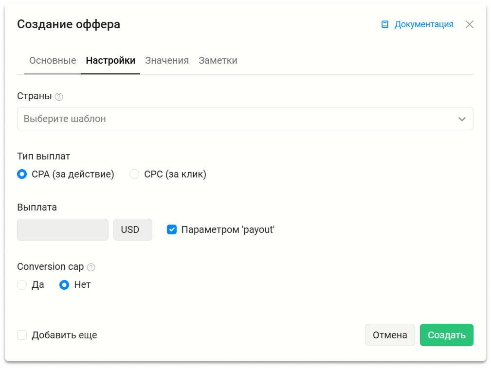 Поле используется как заметка. Указанные страны помогают быстрее подбирать подходящие офферы для потоков. Для таргетинга трафика по странам используйте фильтры в потоках.
