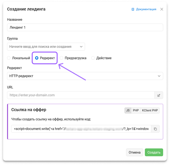 Применяется для лендингов на другом сервере или конструкторе сайтов.
