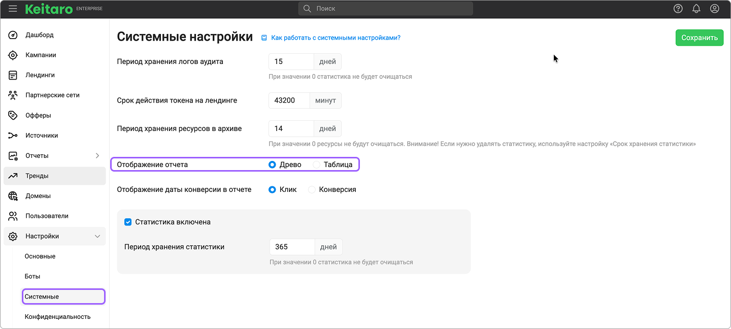 В отчетах с группировками вид Древо выбран по умолчанию. Переключение на вид Таблица и наоборот доступен в Настройках.