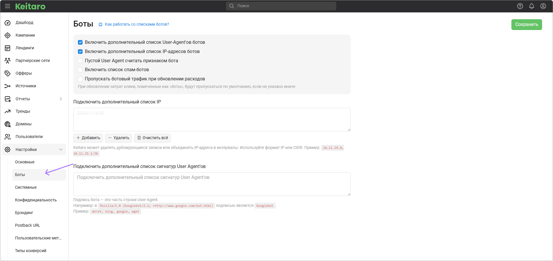 Списки ботов — это возможность добавить необходимые значения IP-адресов или сигнатуры в базу ботов трекера. Дополнительные значения учитываются при проверке фильтром «Бот» в потоке.