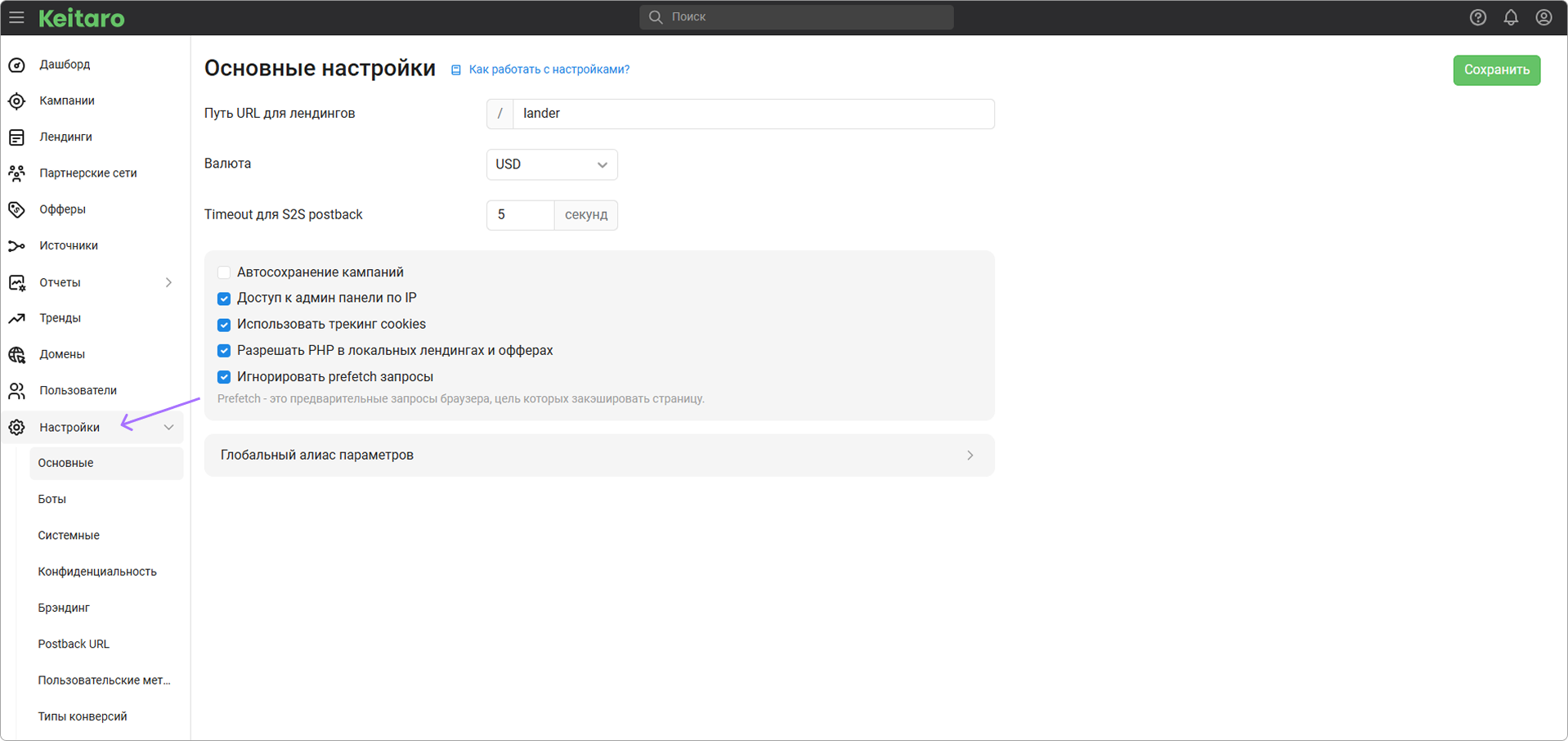 Если выключить настройку, Keitaro прекратит использование cookies.