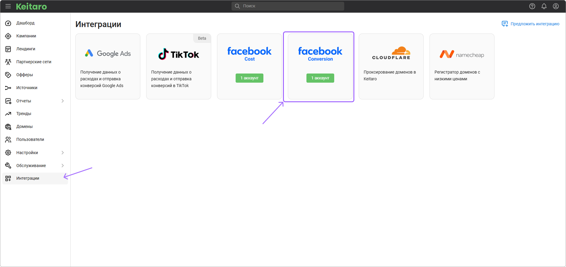 Откройте Интеграции, выберите интеграцию Facebook conversion: