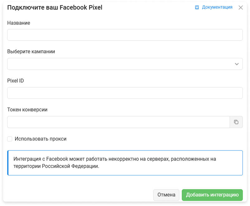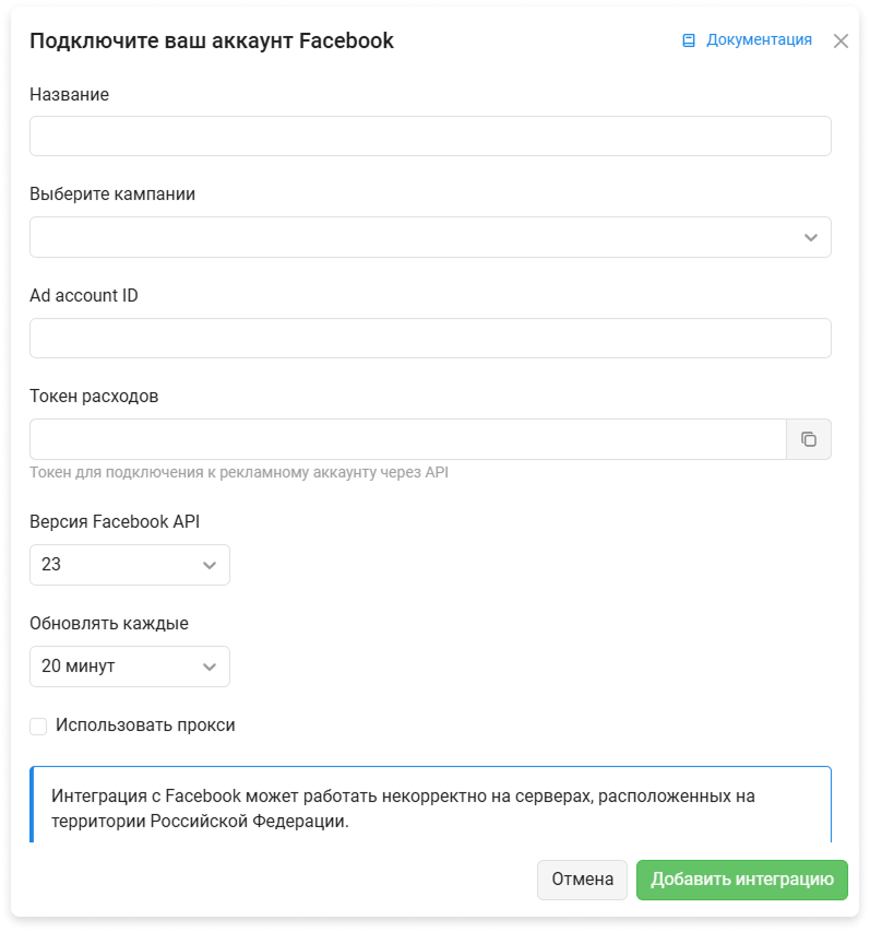 Для стабильного доступа к Facebook используйте прокси. Для настройки перейдите в созданную интеграцию или создайте новую и установите галочку в чекбоксе Использовать прокси: