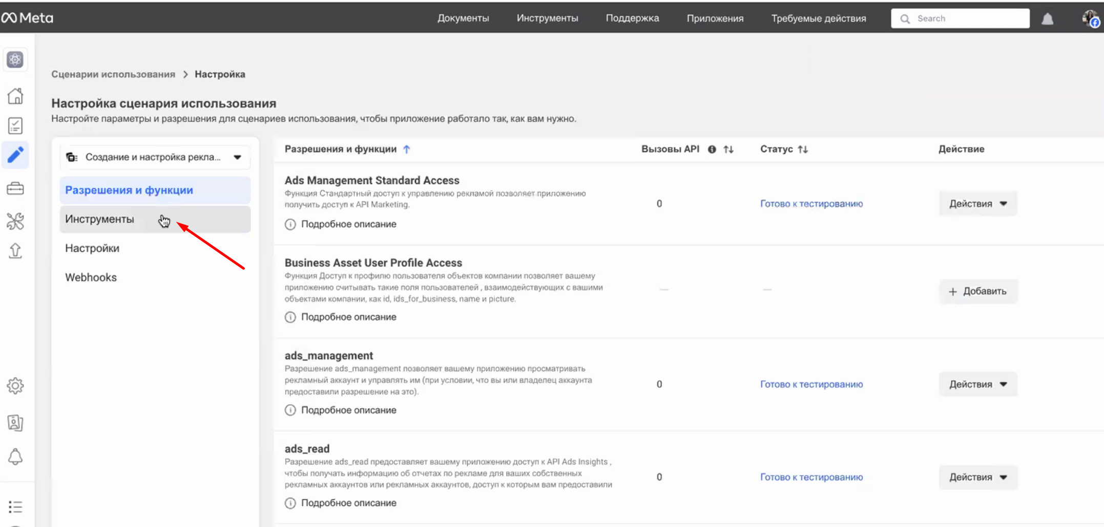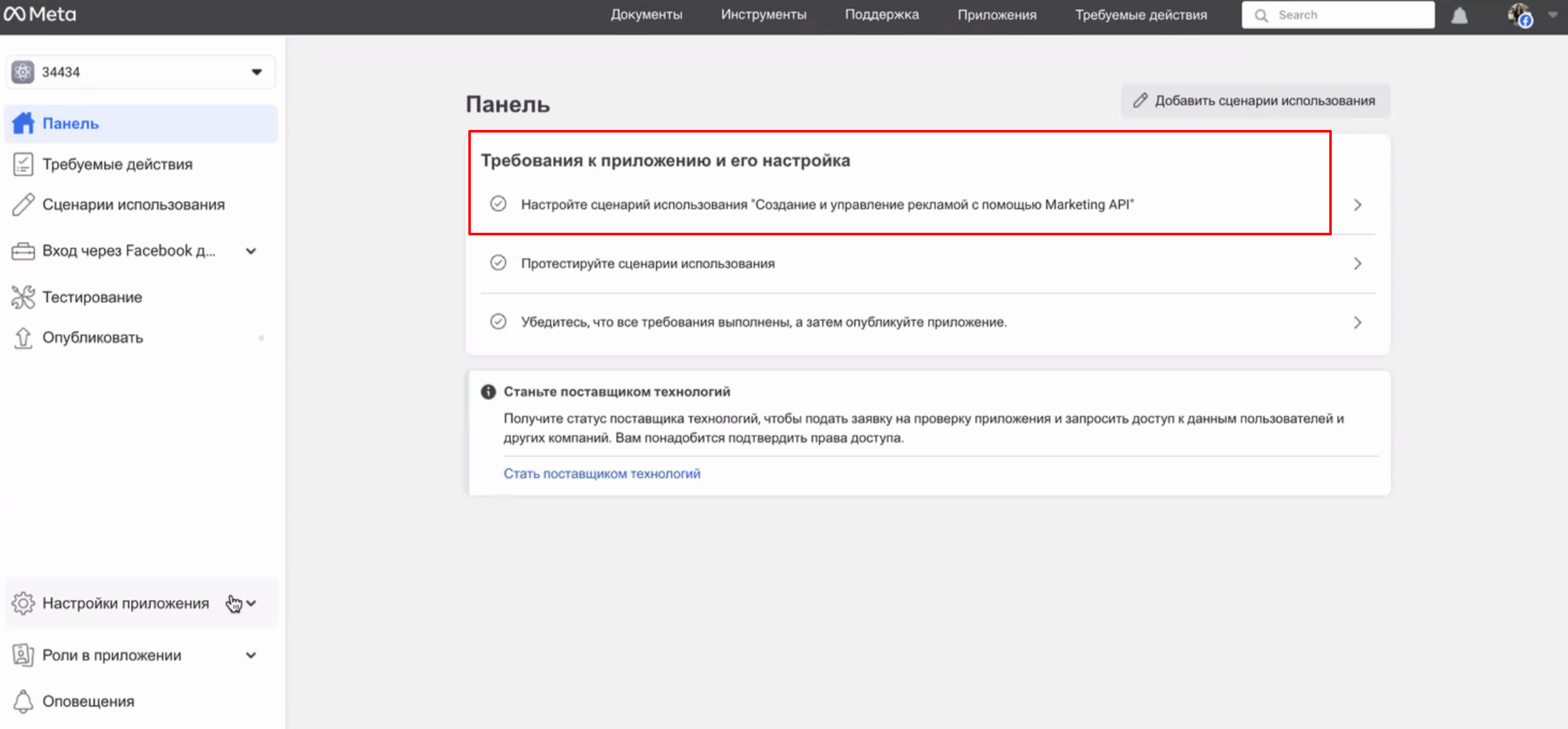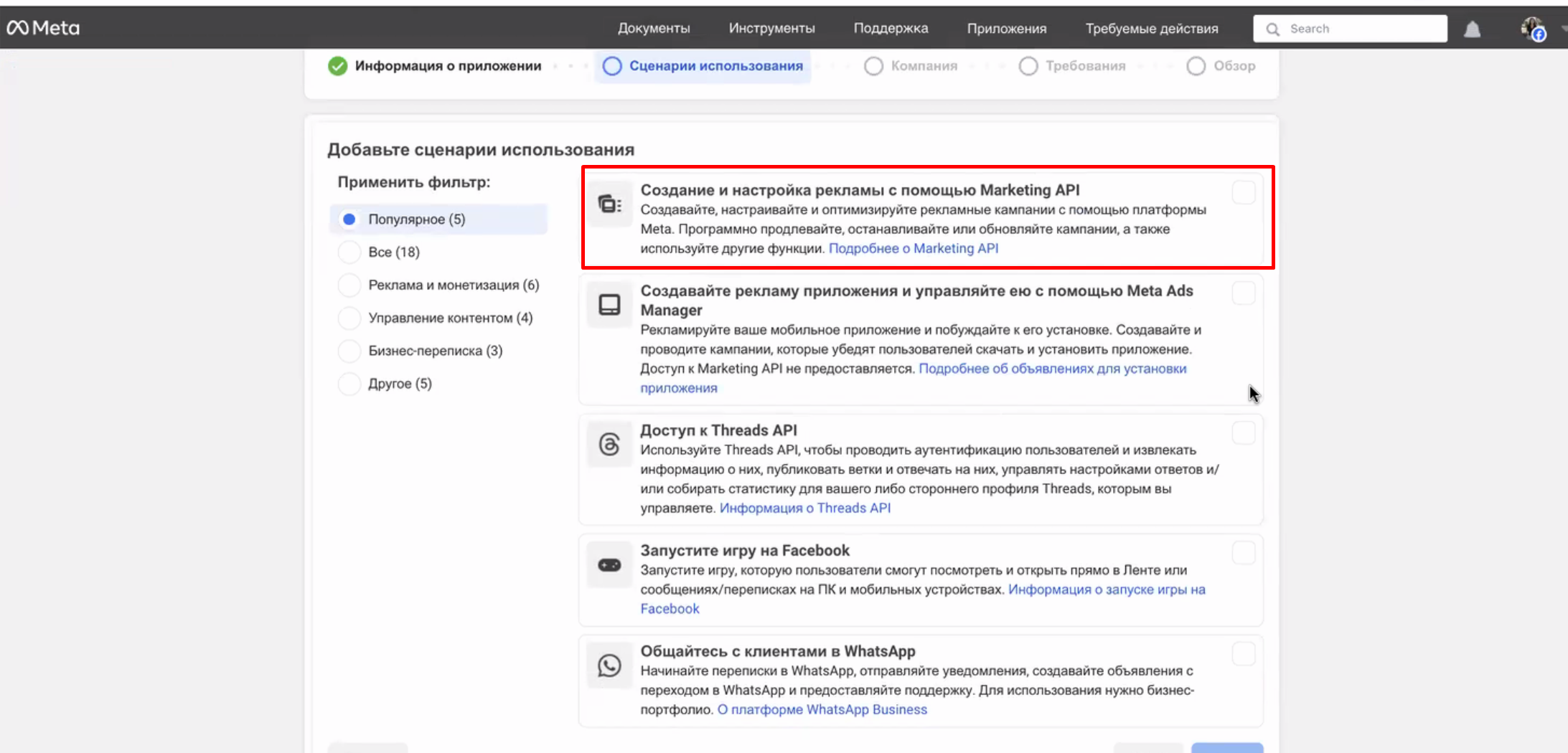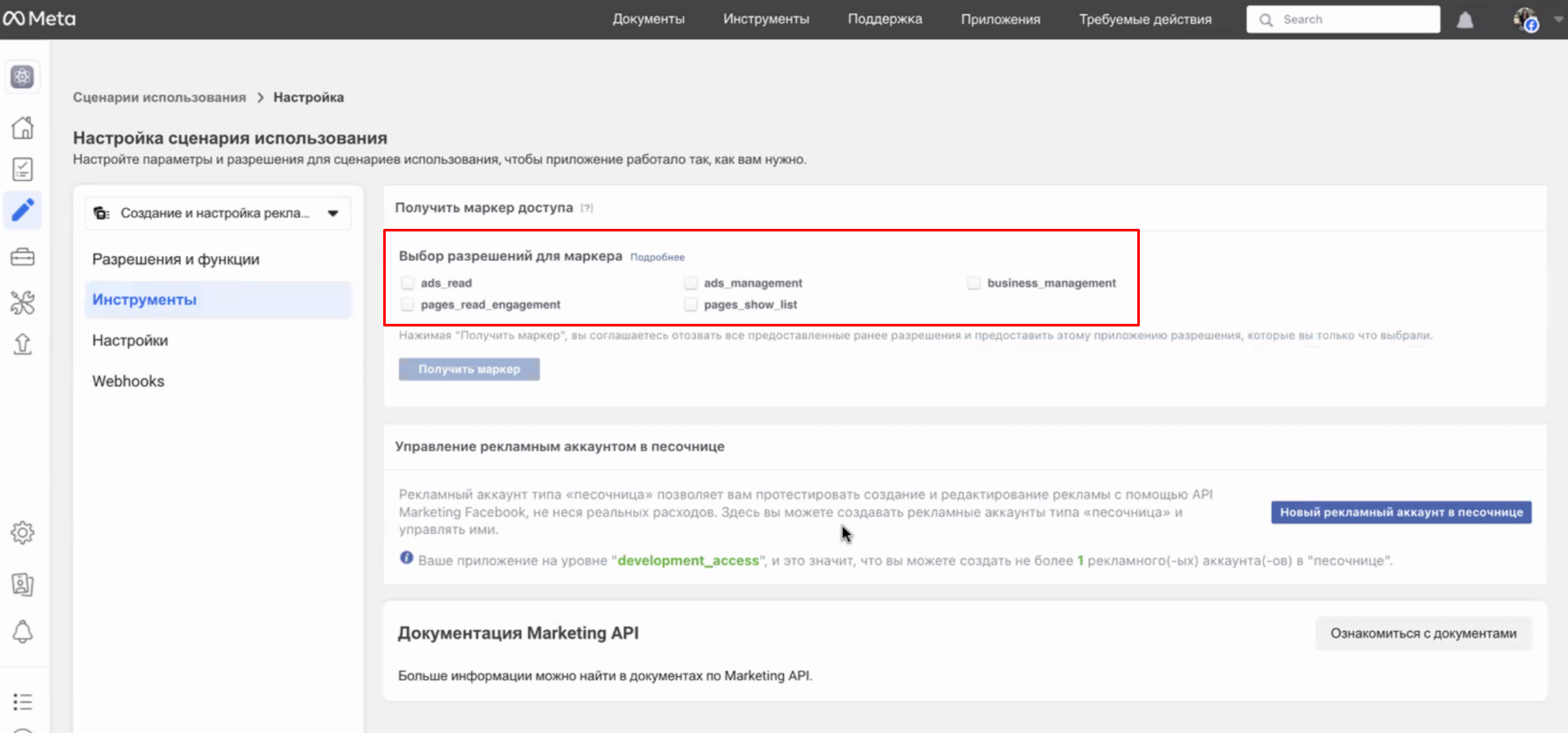 - Создайте новое приложение со сценарием использования Создание и настройка рекламы с помощью Marketing API