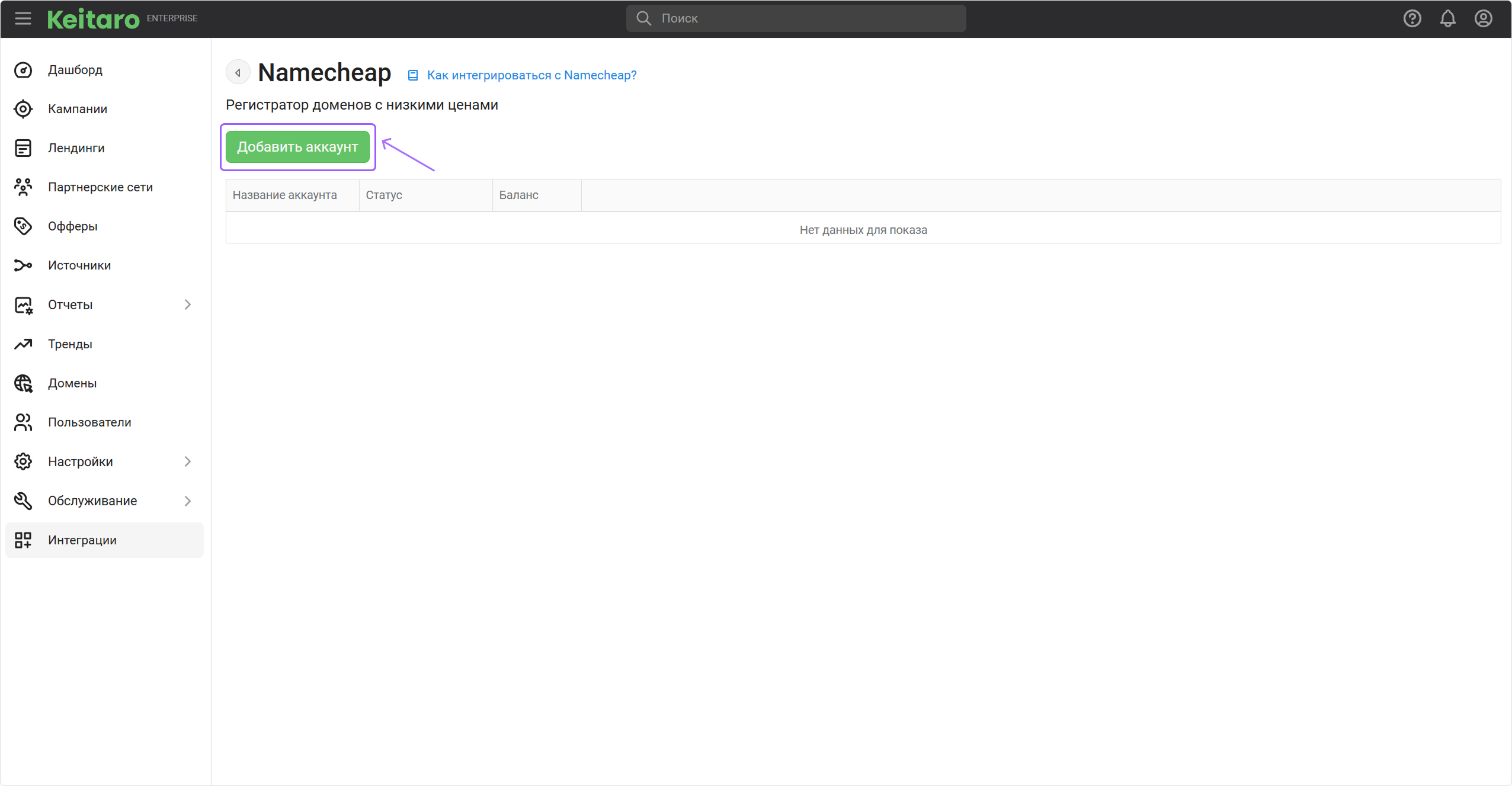 - В Keitaro перейдите в раздел Интеграции → Namecheap, нажмите на кнопку "Добавить аккаунт".
